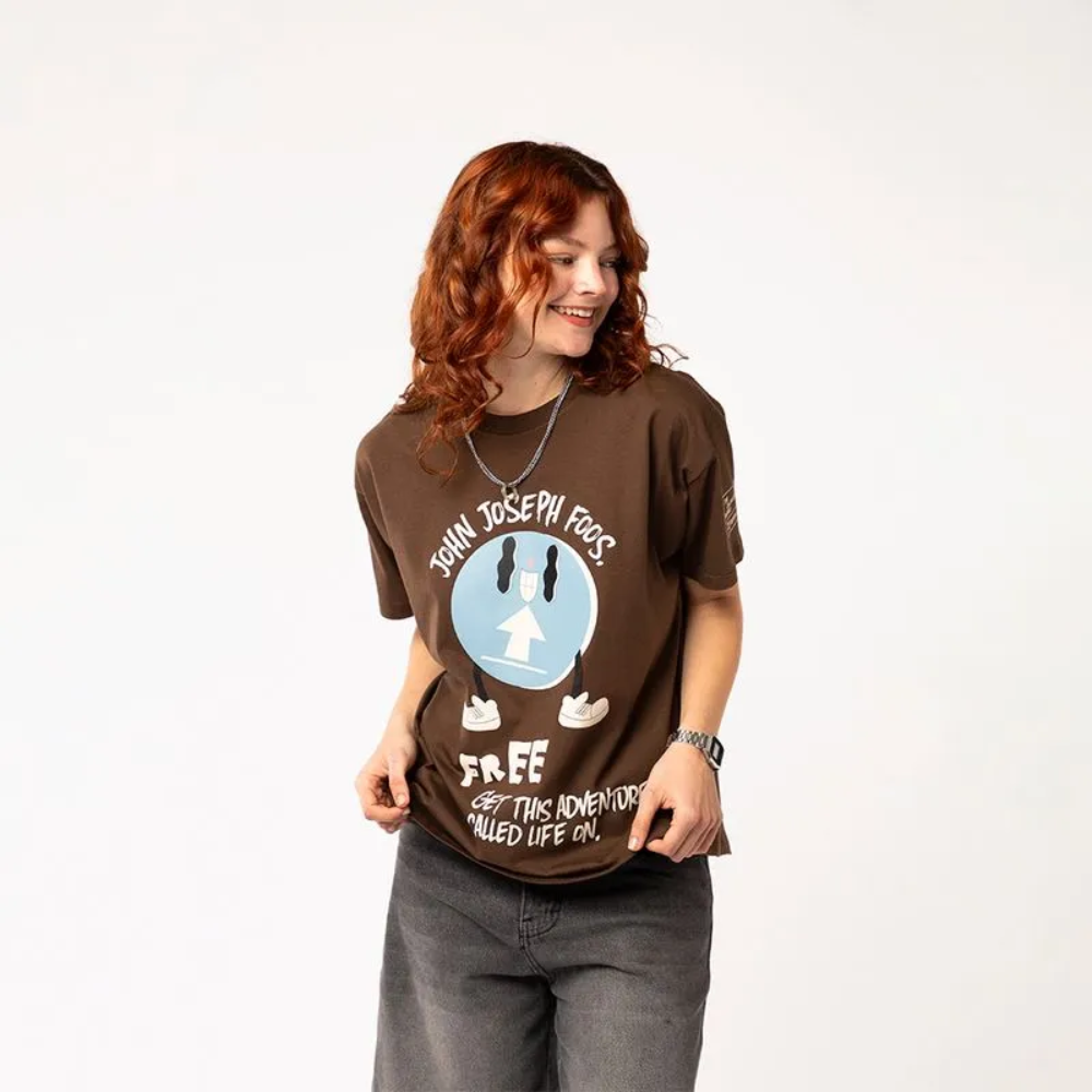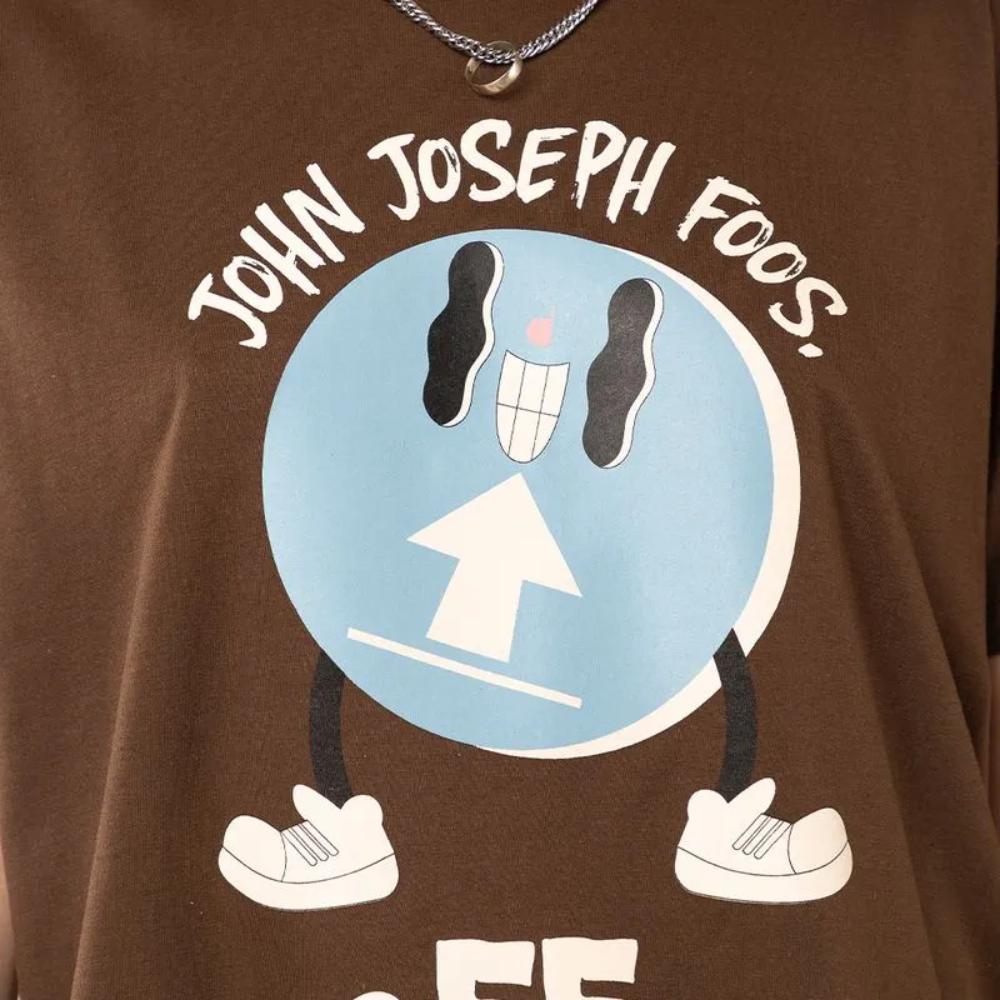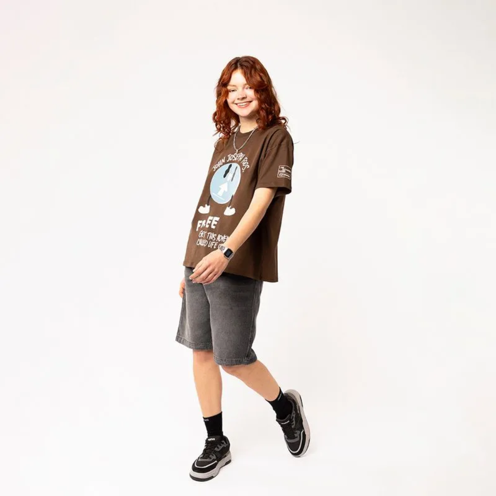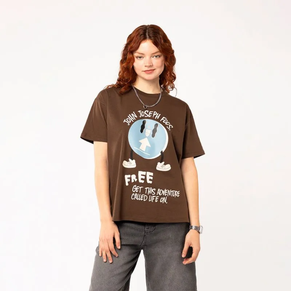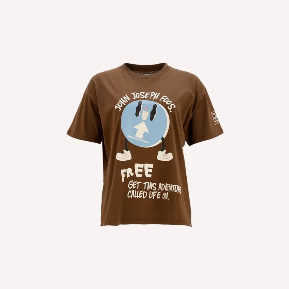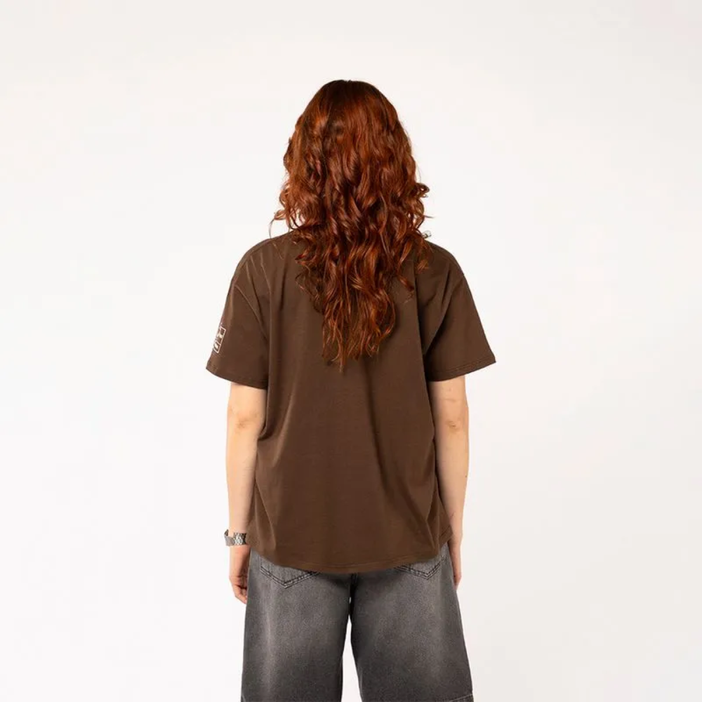 Remera de algodón con corte cropped, diseño único en color marrón con toques celestes y crudos que realzan cualquier look.